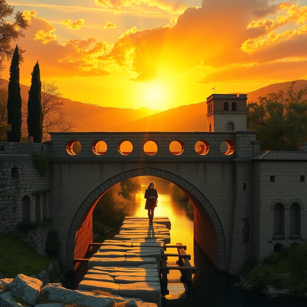 This image shows a lone figure contemplating the medieval Devil's Bridge in Tuscany at sunset. The stone bridge spans the Serchio River, set against rolling hills with cypress and olive trees, in a romantic landscape style.