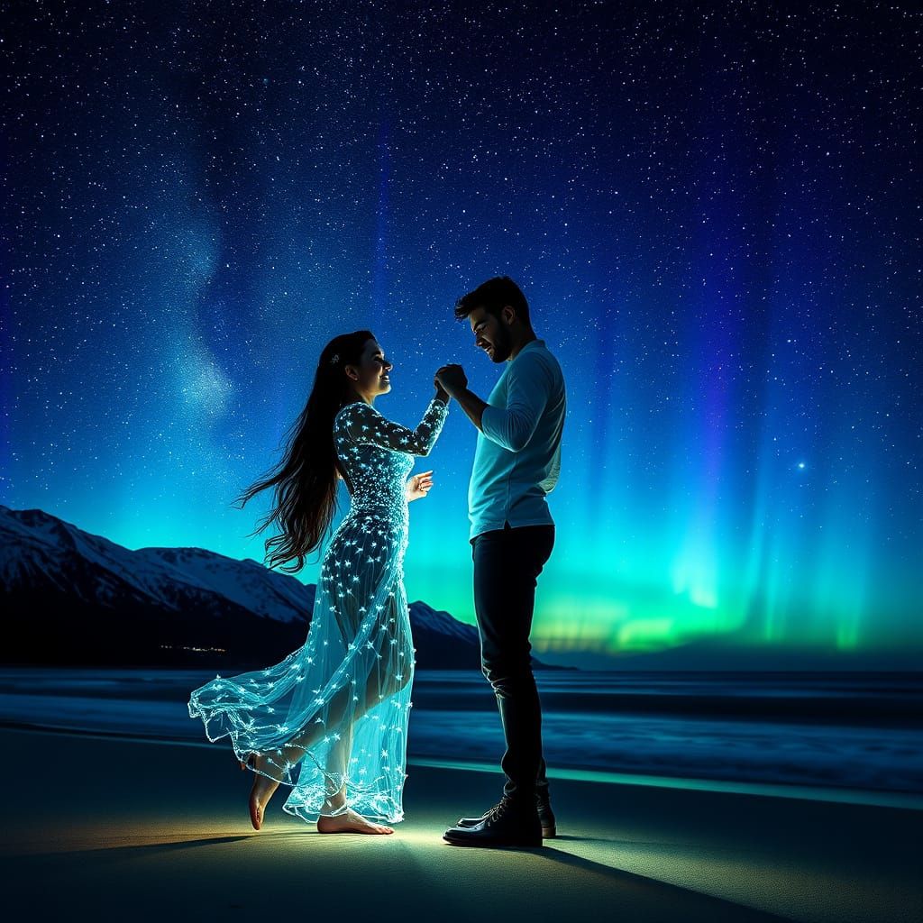 This image shows a couple dancing on a beach beneath a vibrant, star-filled sky. The scene features snow-capped mountains and a turquoise ocean, illuminated by the aurora borealis in airbrush art nouveau style.