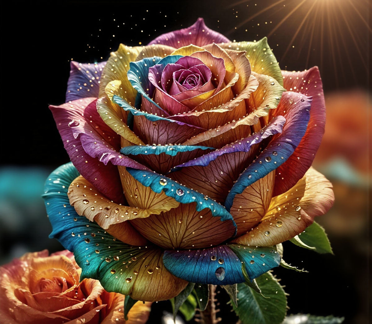 This image shows a vibrant rose with rainbow-colored petals, seemingly made of crystal. The flower reflects light, creating refractions in a hyperrealistic and clean digital style.