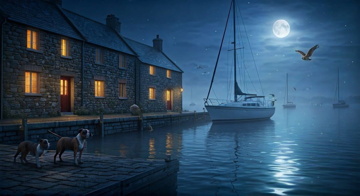 This serene moonlit harbor scene features sailboats, stone cottages, and two American Stafford Terriers guarding playful puppies, set against a soft, velvety mist with a shallow depth of field, capturing the textures and clarity of the subjects in breathtaking hyper-realistic detail.