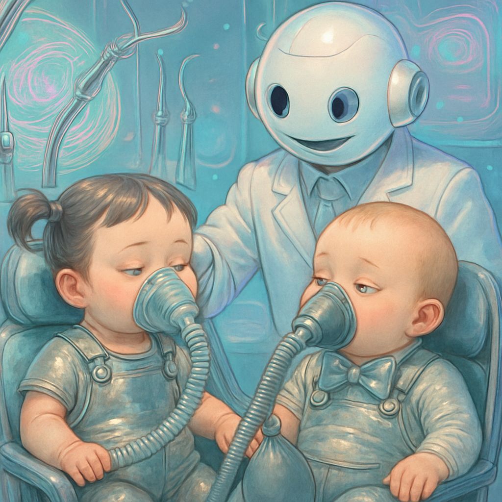 A surreal image showing two babies in a futuristic dental setting. A robot dentist uses high-tech and vintage tools on them amidst holographic displays, with pastel hues and fantasy details.