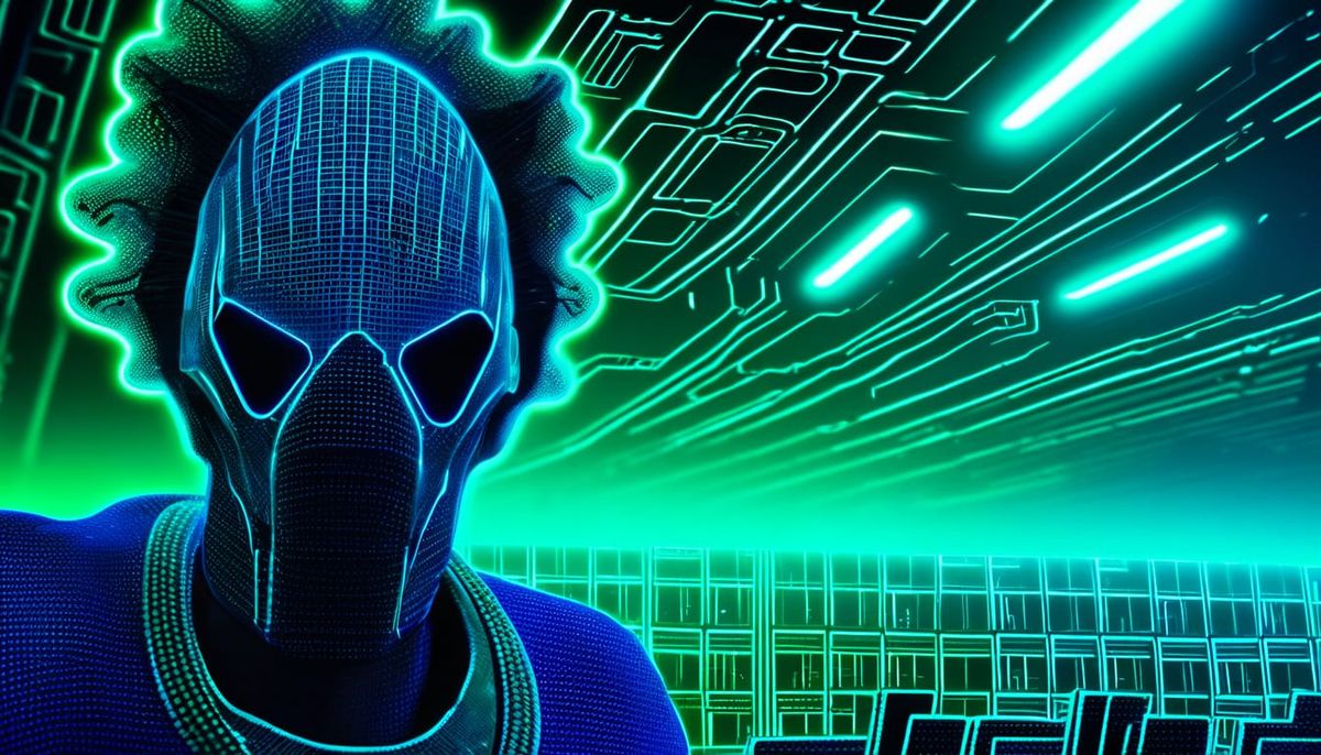 This image shows an alien wearing a futuristic helmet in a neon noir style. The close-up shot features glowing blue circuits, metallic textures, and high contrast lighting against a dark grid.