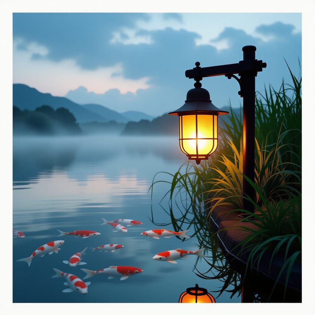 This image shows an electric storm vortex over a naive Japanese landscape, featuring a koi pond and illuminated grass. The style evokes an old polaroid with a surreal, chaotic mood.