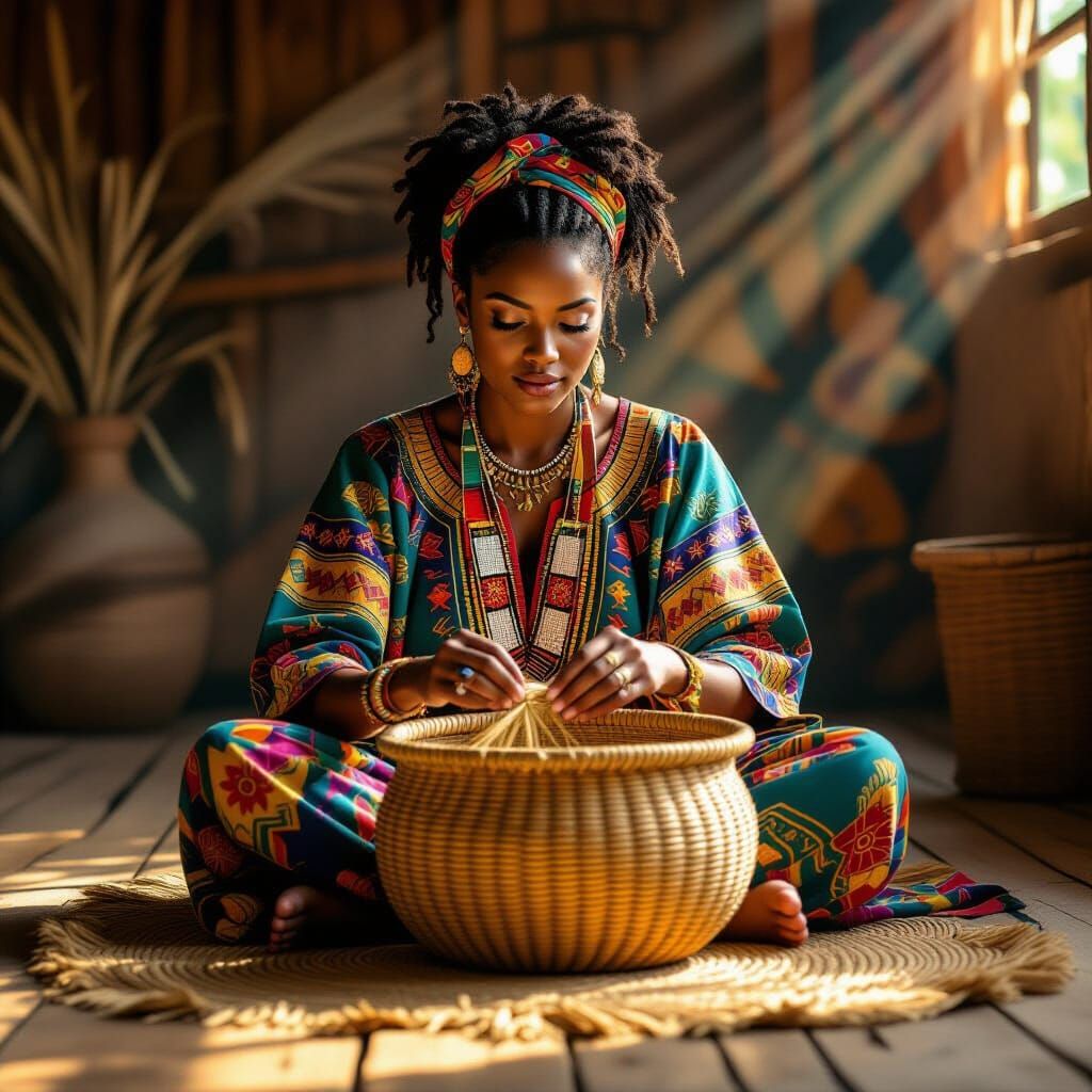 This image shows an African American woman seated on a wooden floor, skillfully weaving a large sweetgrass basket. She is adorned with a colorful dashiki and traditional jewelry, captured in a cinematic matte painting style.