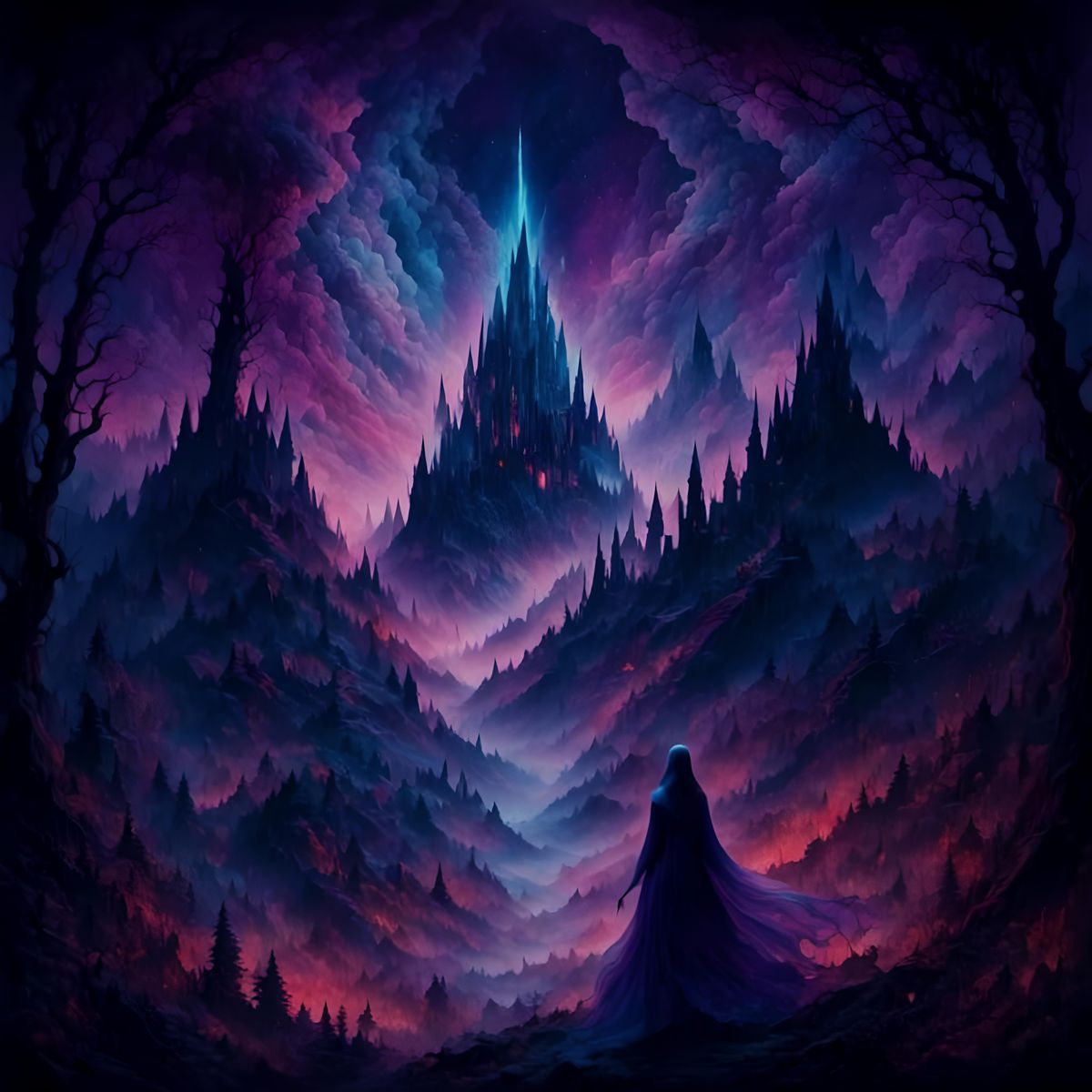 A blurry, dark image featuring hazy abstract patterns in diffused shades of purple and blue. Outlines of pine trees and a ghostly figure rise above a dark forest in ethereal style.
