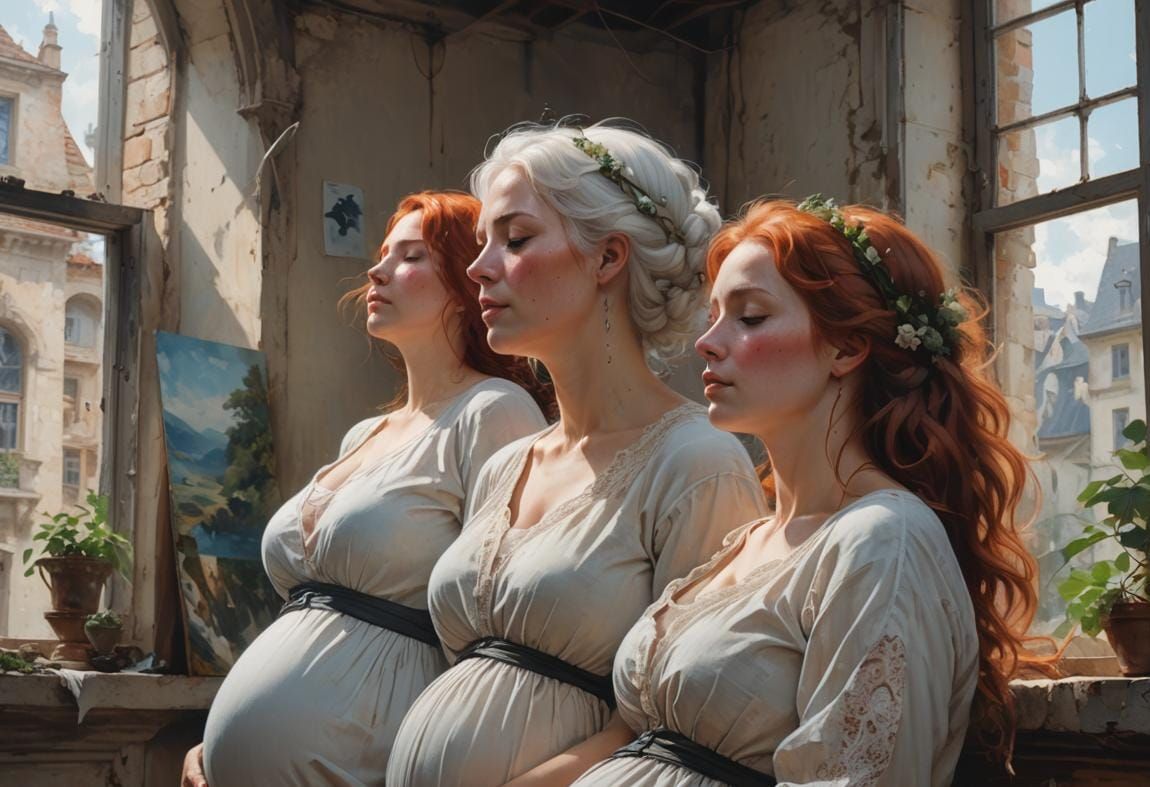 This image shows two pregnant women with striking features in a brightly lit setting. The subjects have contrasting hair colors and are depicted with a focus on intricate details.