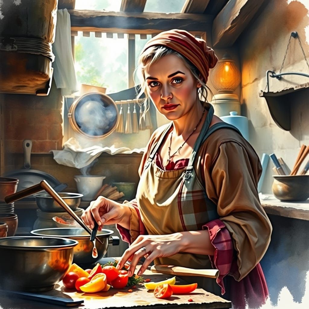 This image shows a middle-aged woman cooking in a medieval kitchen. The artwork is rendered in light watercolors and an analogous color palette, creating a hyperrealistic and detailed scene.