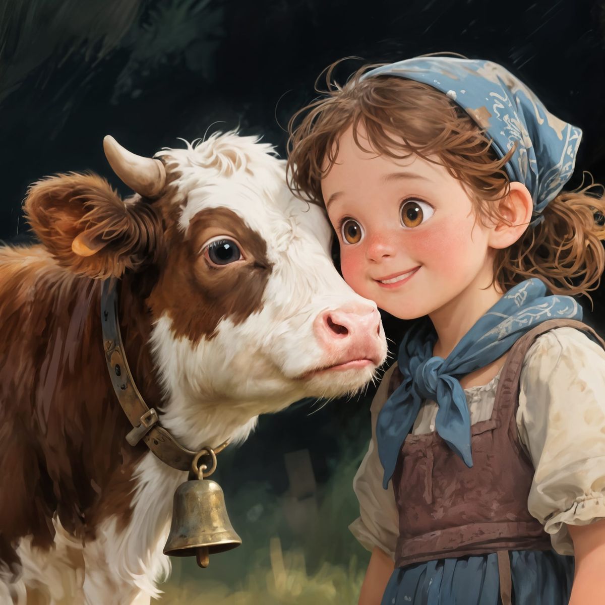 This digital painting shows a smiling farm girl with a bandana resting her cheek against a gentle calf. Soft light and painterly background create a heartwarming, storybook feel.