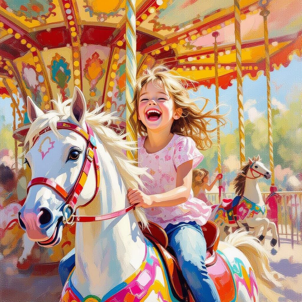 A vibrant watercolor painting capturing a joyful girl on a carousel horse. The impasto technique and impressionistic style evoke a sunny, delightful playground scene.