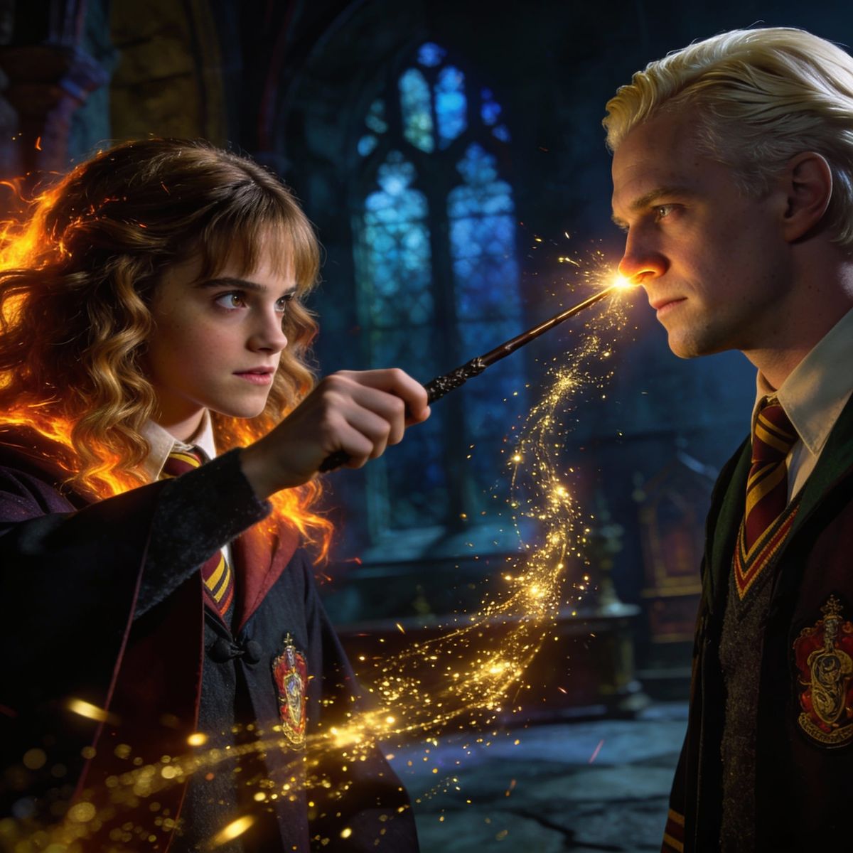 This image depicts Hermione Granger with fiery determination, striking Draco Malfoy's nose. The scene is rendered with deep colors and intricate detail in a fantasy concept art style, emphasizing dramatic lighting and realism.