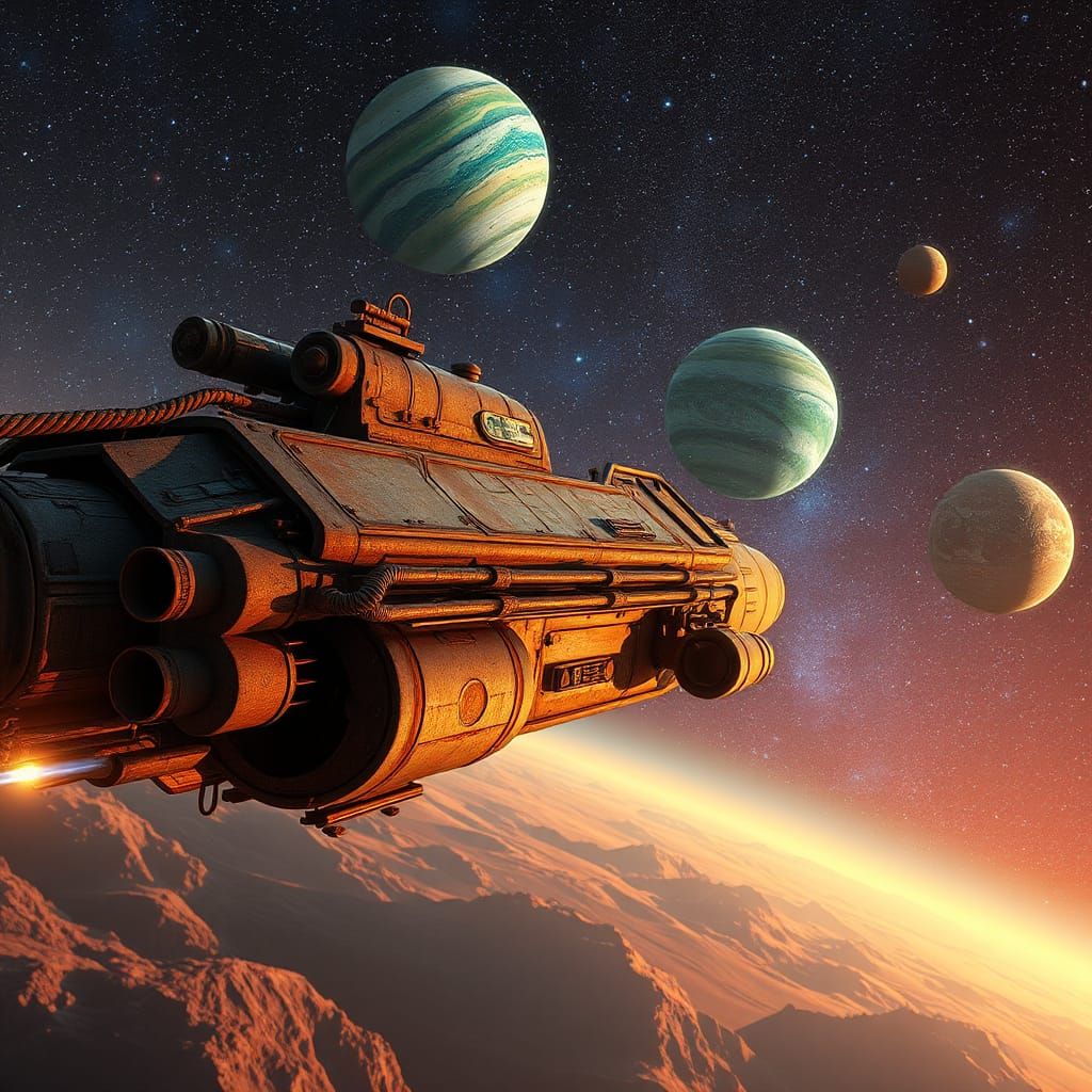 A striking picture of a retro spaceship flying through a cosmic scene. The image evokes early 3D graphics with scanlines and film grain, creating a nostalgic retro-futuristic aesthetic.