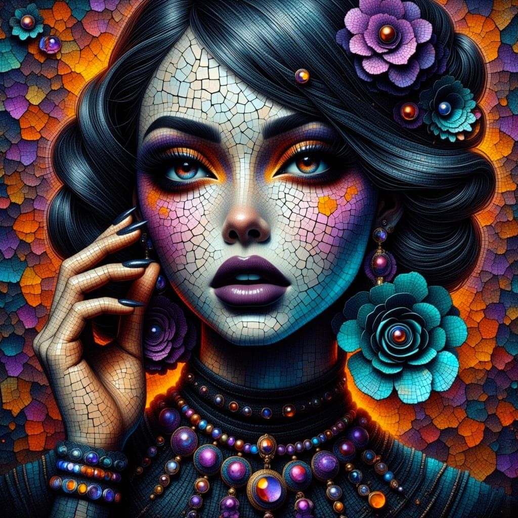 A mosaic portrait of a goth grunge beauty with shimmering, colorful bokeh. The textured 3D mosaic art style features crackled porcelain break lines and a vibrant composition.