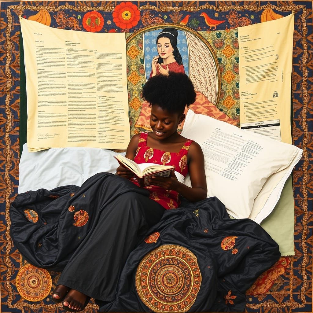 A serene scene of a woman engrossed in a book while comfortably seated in bed. This artwork blends abstract elements with textured details, reminiscent of contemporary art styles.
