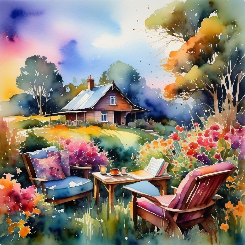 A watercolour painting of a cosy home with a veranda in a rural garden. The painting uses sunset colours, ink details and dark vignettes to create an ethereal, abstract art style.