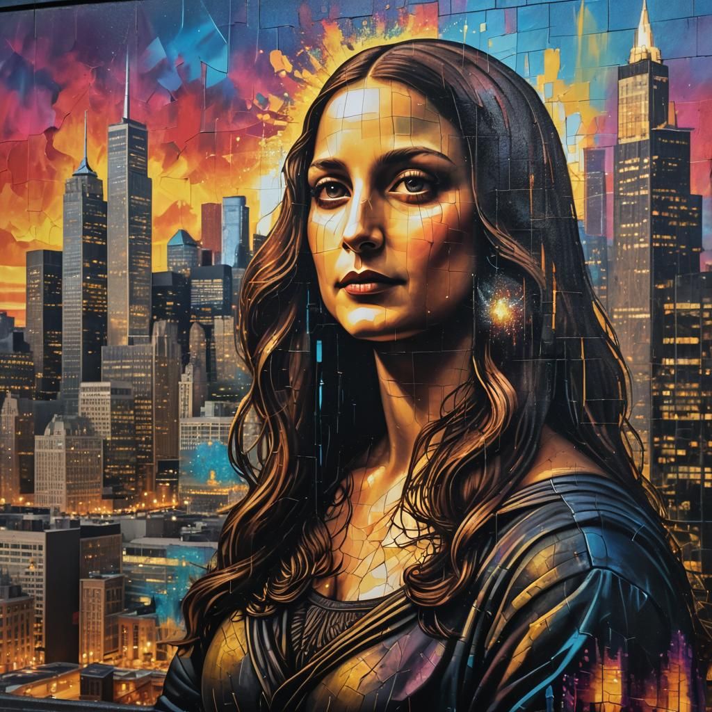 A mural of the Mona Lisa on the John Hancock building in Chicago. The artwork features soft brush textures, vibrant colors and detailed cracks, with side lighting and a warm glow. This digital artwork captures an energetic urban feel.