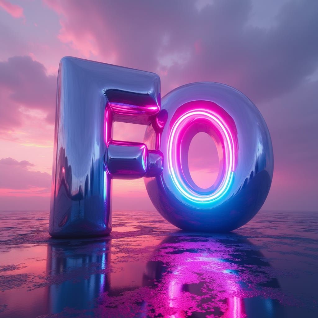 This image shows giant metallic letters H and FO with neon fuchsia and blue fills, standing on a wet reflective surface. A cyberpunk sunset with purple and pink clouds completes the 3D rendered scene.