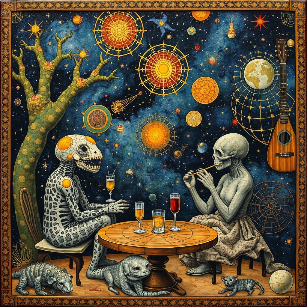 A vibrant image showcasing a psychedelic utopia filled with sacred geometry. The artwork features bizarre creatures in a maximalist style, reminiscent of an oil painting. A scene of cosmic revelry.