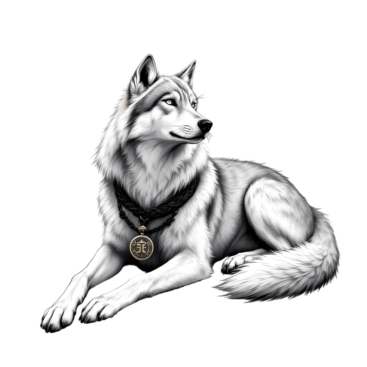 This image shows a noble arctic wolf in a 19th-century engraving style. The wolf has silvery fur with charcoal shadows, amber eyes, and distinctive markings, enhanced by classic shading and minimal background.