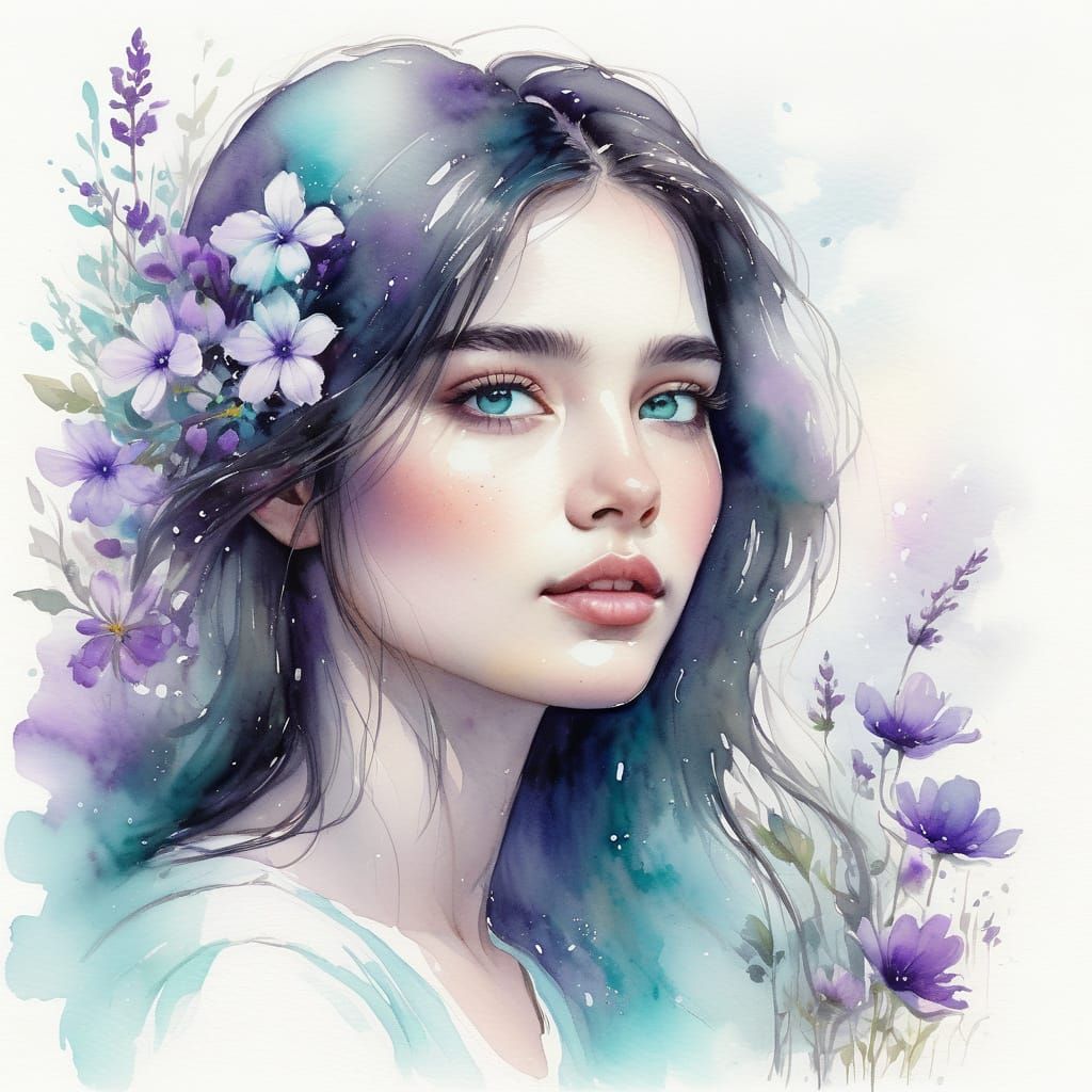 This realistic sketch style portrait features a woman with dark hair and striking turquoise eyes, set against a misty moonlight scene with springtime flowers. Rendered in watercolor and pencil.