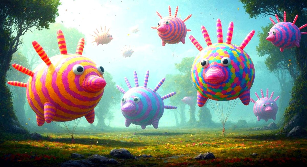 This image shows a vibrant parade with giant, imaginative creatures constructed from colorful balloons, floating through a surreal, dreamlike landscape with soft lighting.