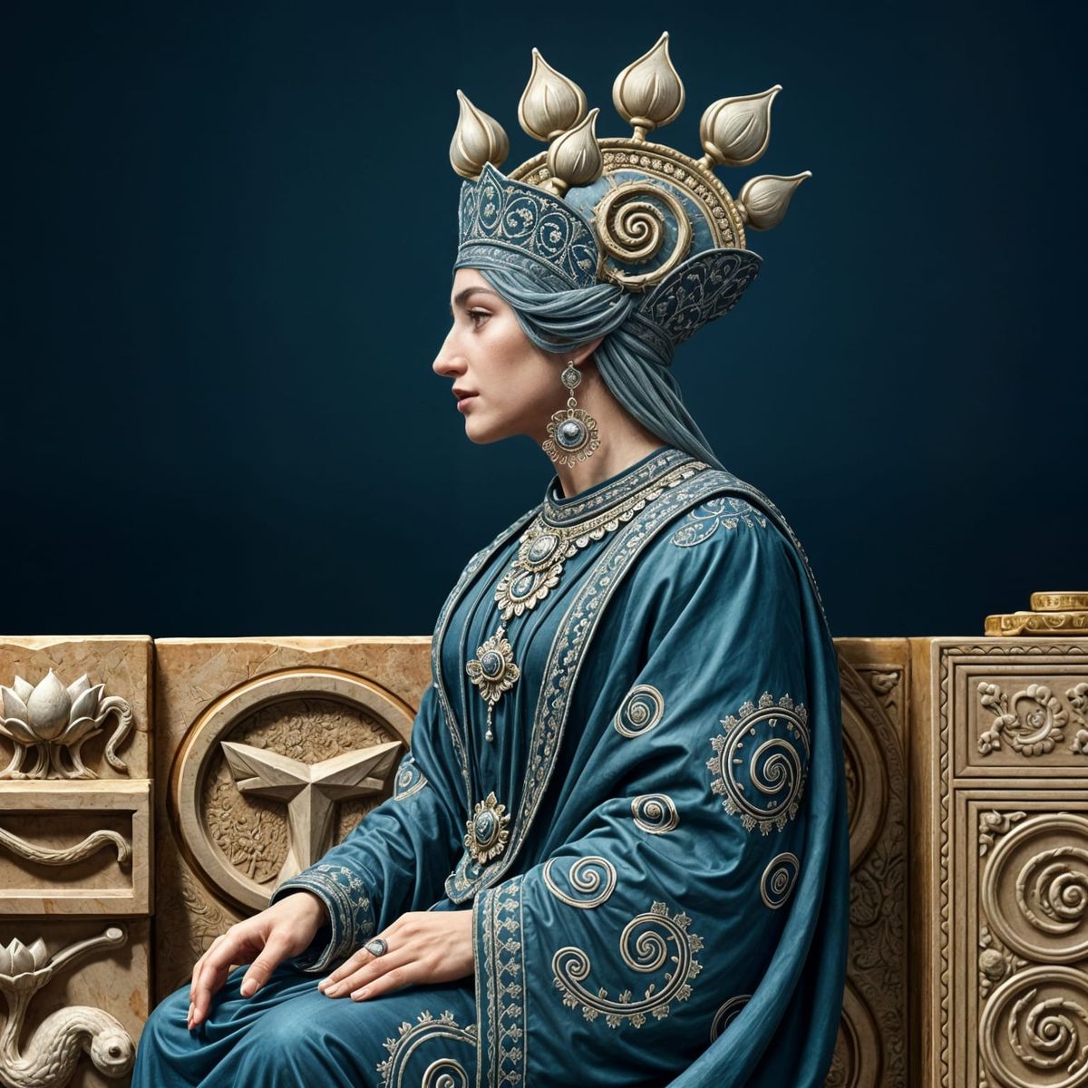A portrait of an Achaemenid queen adorned in regal attire, wearing a magnificent crown shaped like a lotus in full bloom. Her earrings and necklace reflect the same motif. She is seated in profile on a carved stone throne, with lotus carvings along the base.