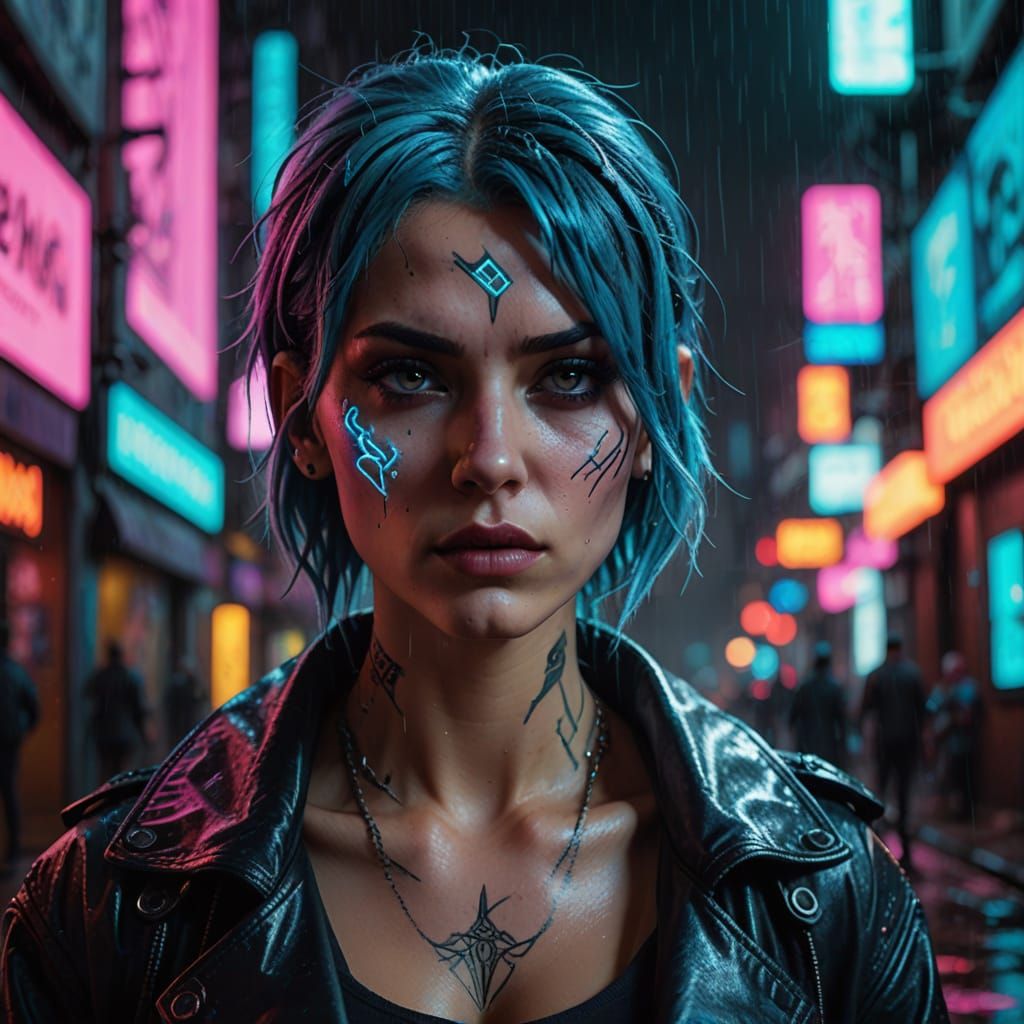 A striking image of a cyberpunk assassin in a neon-lit, rain-slicked alley. The woman with cybernetic enhancements is portrayed with photorealistic detail in a cinematic, high-contrast style.