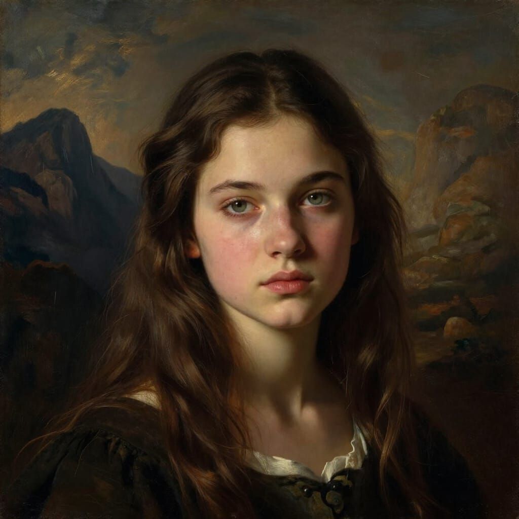 This image features a striking portrait of a young woman with dark hair and intense gray-green eyes, bathed in dramatic chiaroscuro lighting. Painted in a Romanticism style, it evokes atmospheric depth and rich earthy tones.