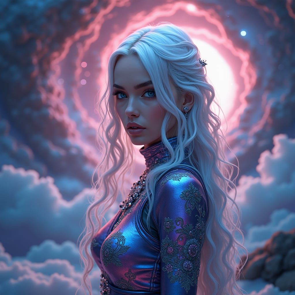 This stunning portrait depicts a woman with flowing silver hair and piercing blue eyes, wearing intricately detailed, colorful clothing that shimmers like the aurora borealis. Set against a swirling vortex of galaxies, this hyperrealistic image evokes a sense of cosmic wonder and awe.