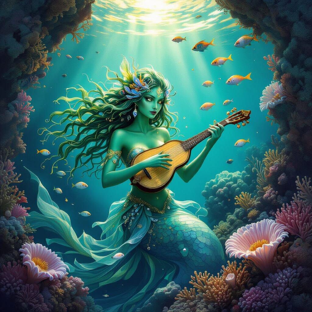 This image shows an ethereal siren with green skin and seaweed hair playing a lyre underwater. Colorful fish swim among coral in this luminous, illustrative artwork.