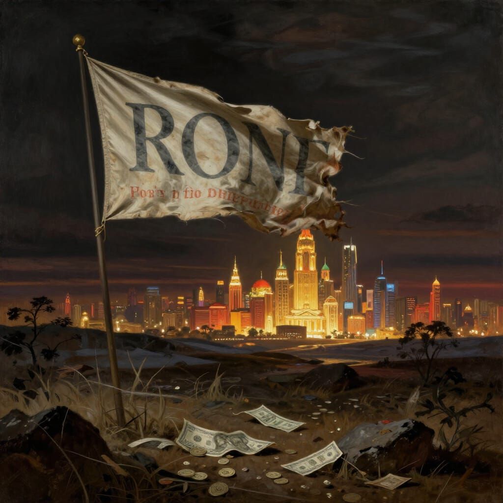 This image depicts a stark, wind-swept scene with a tattered flag symbolizing lost fortune, contrasting with a vibrant, wealthy city on the horizon. Created in a hyperrealistic digital painting style with dramatic lighting and rich colors.