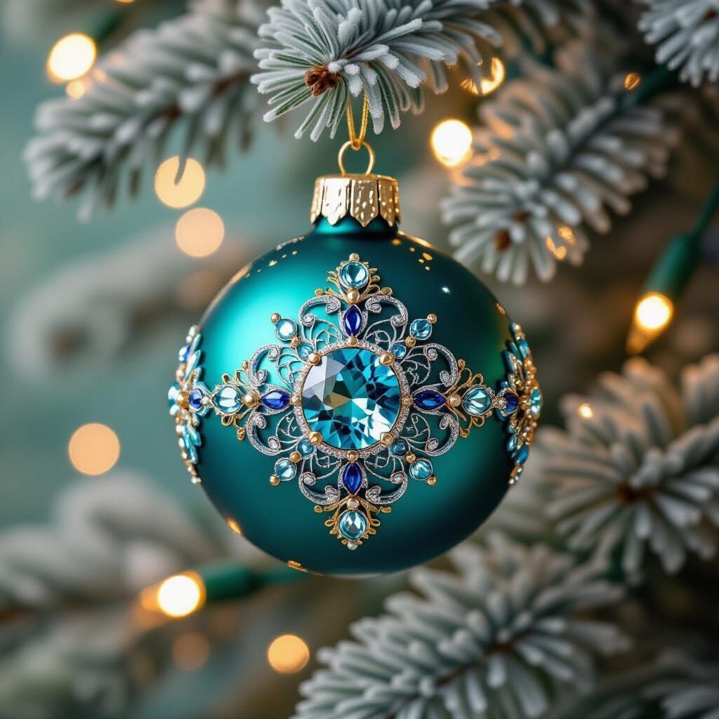 This image features a close-up of a clear teal glass Christmas ornament with intricate silver and gold filigree, detailed jewels, and a central aquamarine gem. Rendered in a highly detailed Art Nouveau style with impasto acrylic techniques.