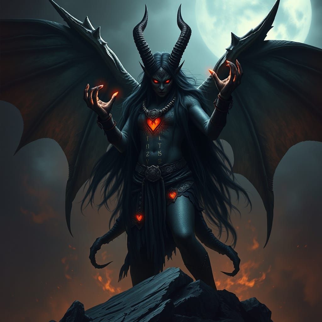 A dramatic image of a demon queen on a mountain summoning dark magic. The figure has dragon wings and is rendered with gritty textures, cinematic lighting, and a gothic horror aesthetic.