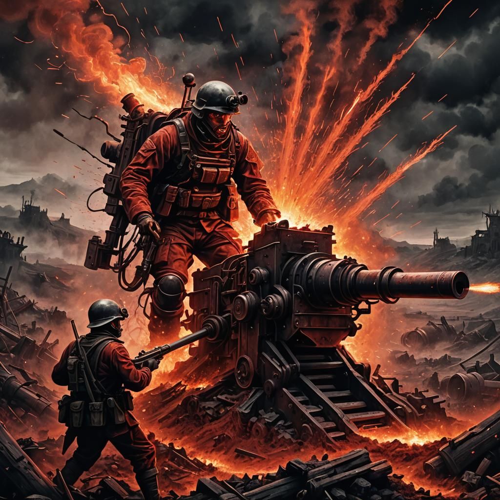 A horrifying image shows a soldier trapped in the spinning barrels of a minigun amidst a hellish landscape. This dark fantasy artwork features chiaroscuro lighting and intense colors.