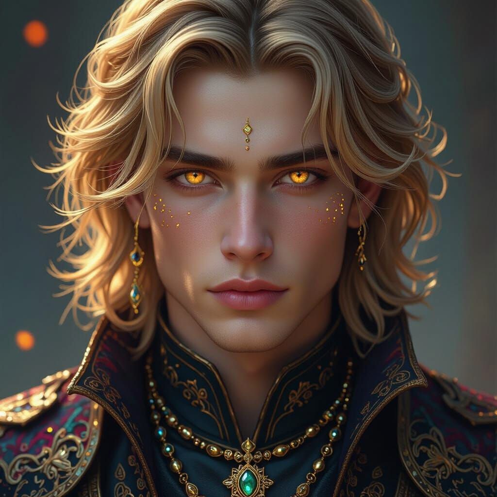 This hyperrealistic image showcases a fantasy concept art piece of a young man with fiery golden eyes and pale skin, wearing detailed, dark, colorful clothing and a unique necklace. The artwork features intricate details and cinematic lighting.