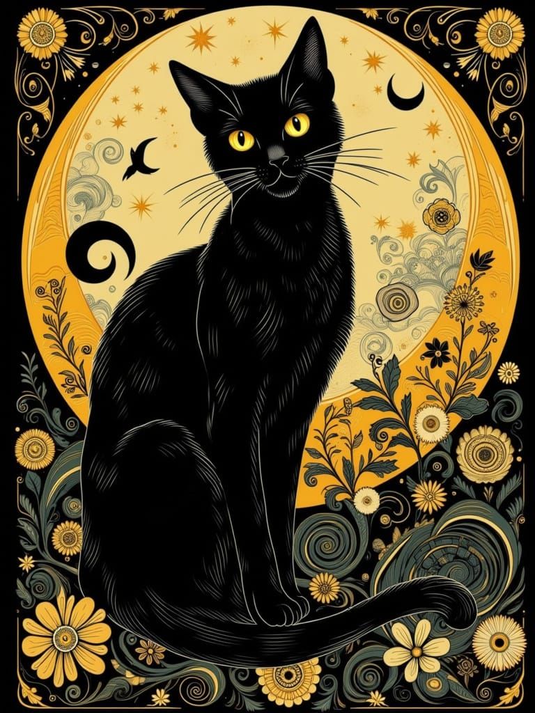 An elegant black cat with striking eyes sits among stylized vines and crescent moons. This illustration features intricate patterns and a limited palette of deep blacks, muted golds, and jewel tones.