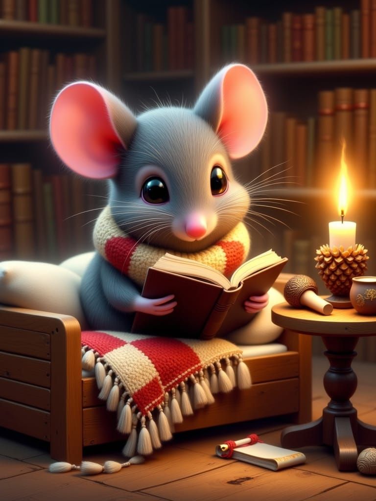 A whimsical hyper-detailed digital painting of a tiny gray mouse with pink ears, pink nose, large glossy black eyes, and white whiskers, sitting upright in a small wooden box bed, reading an open book held in both front paws. The mouse wears a cream and red knitted scarf with diamond patterns and tasseled ...