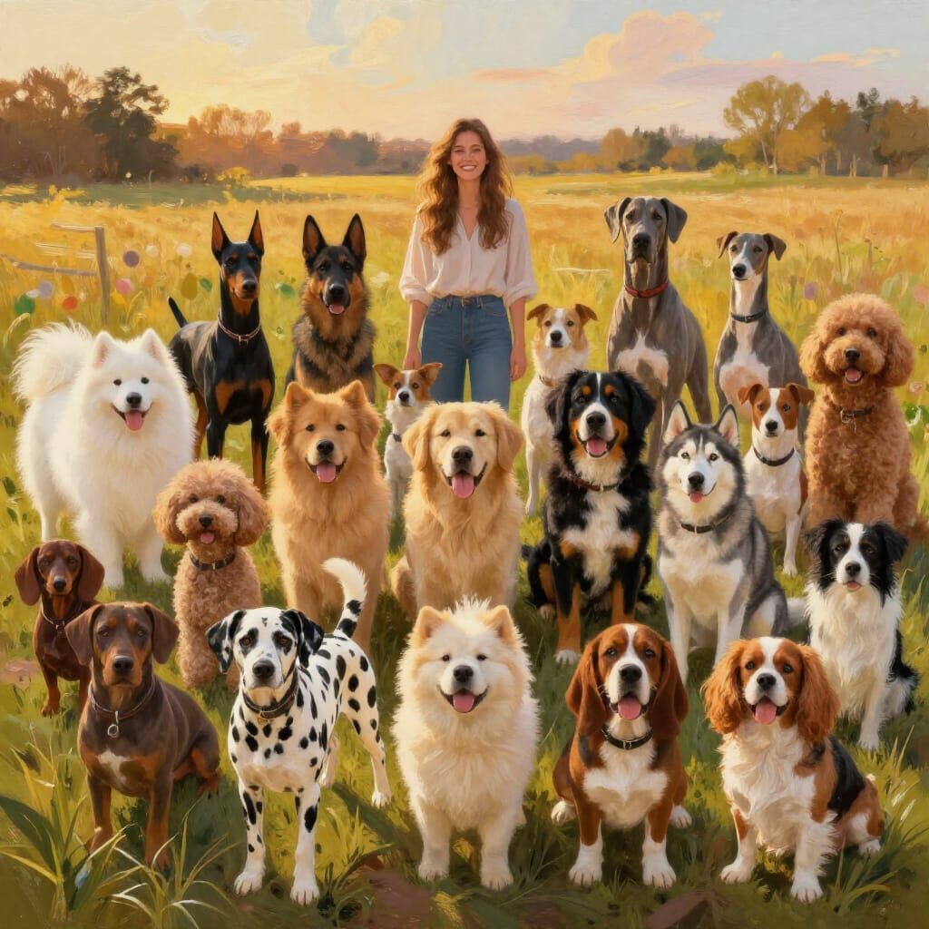This image shows a woman with brown hair on a farm surrounded by 25 different dog breeds during golden hour. Rendered in a vibrant, painterly style.