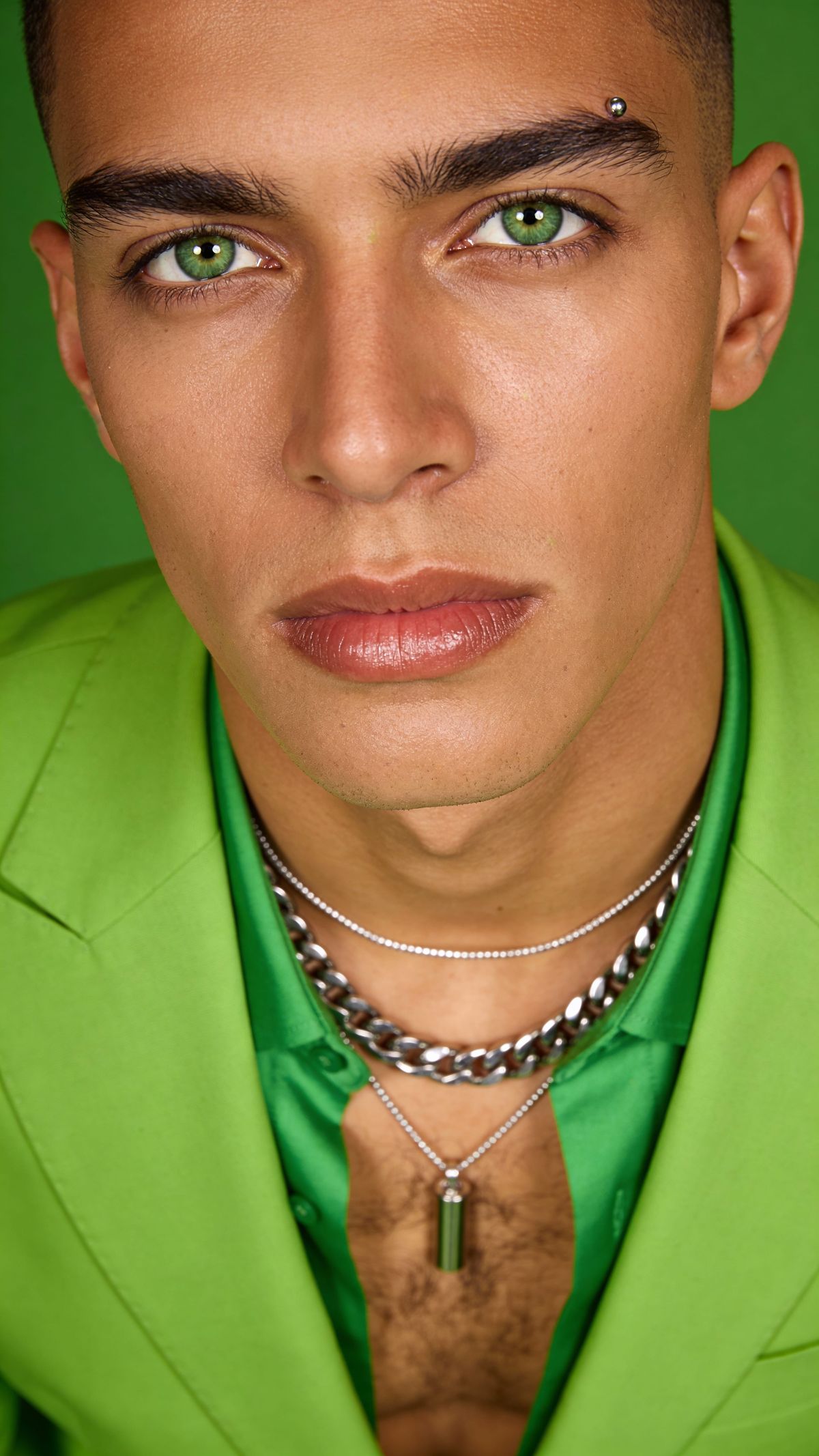 A close-up fashion portrait of a 23-year-old male model with chiseled features, piercing green eyes, and a silver eyebrow piercing. He wears a monochromatic emerald green suit and jewelry against a matching background, captured in high-end editorial style.