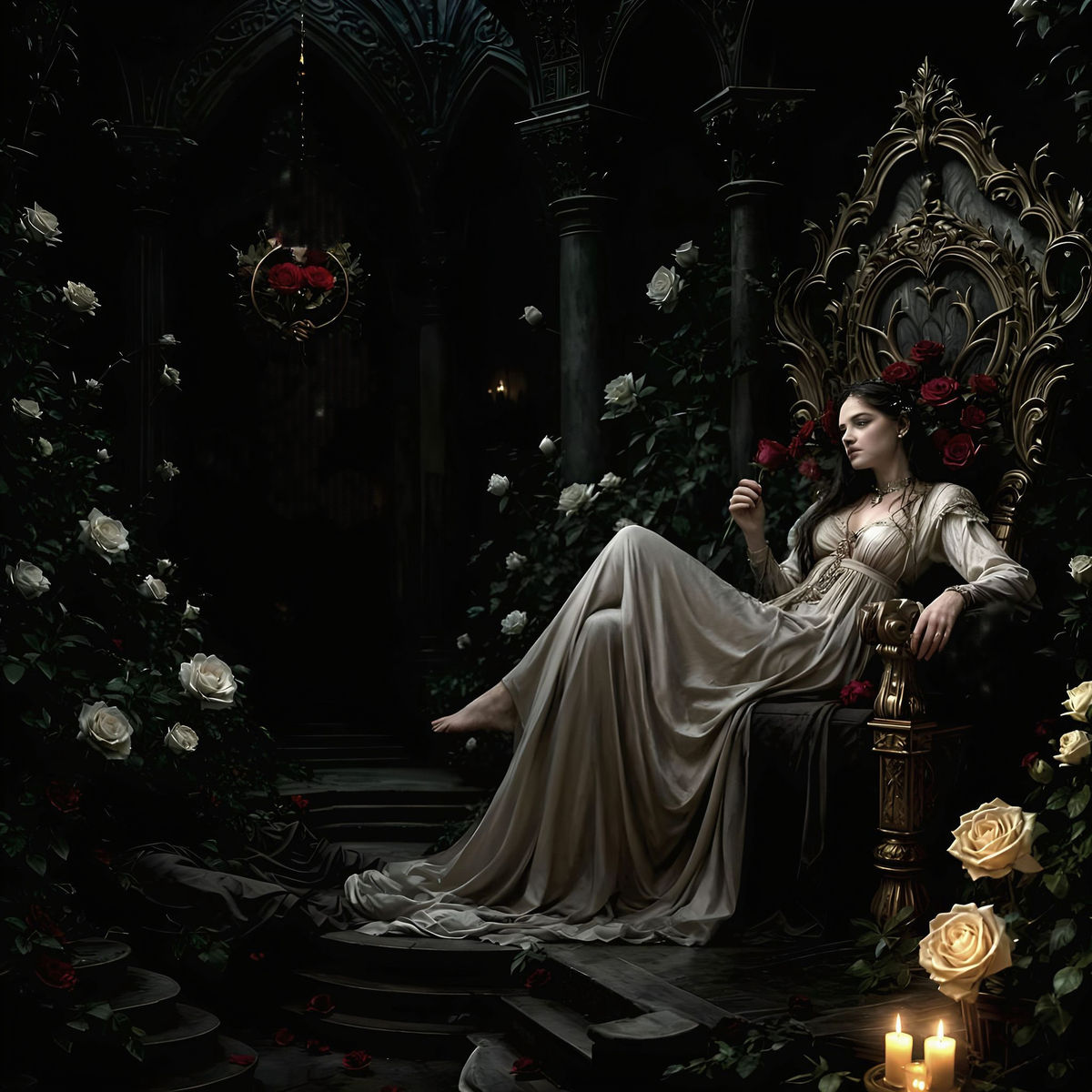 This image depicts Persephone, Queen of the Underworld, seated on a grand throne surrounded by white roses. She holds a single blood-red rose, with fallen petals in her lap. The scene evokes a gothic, medieval aesthetic.