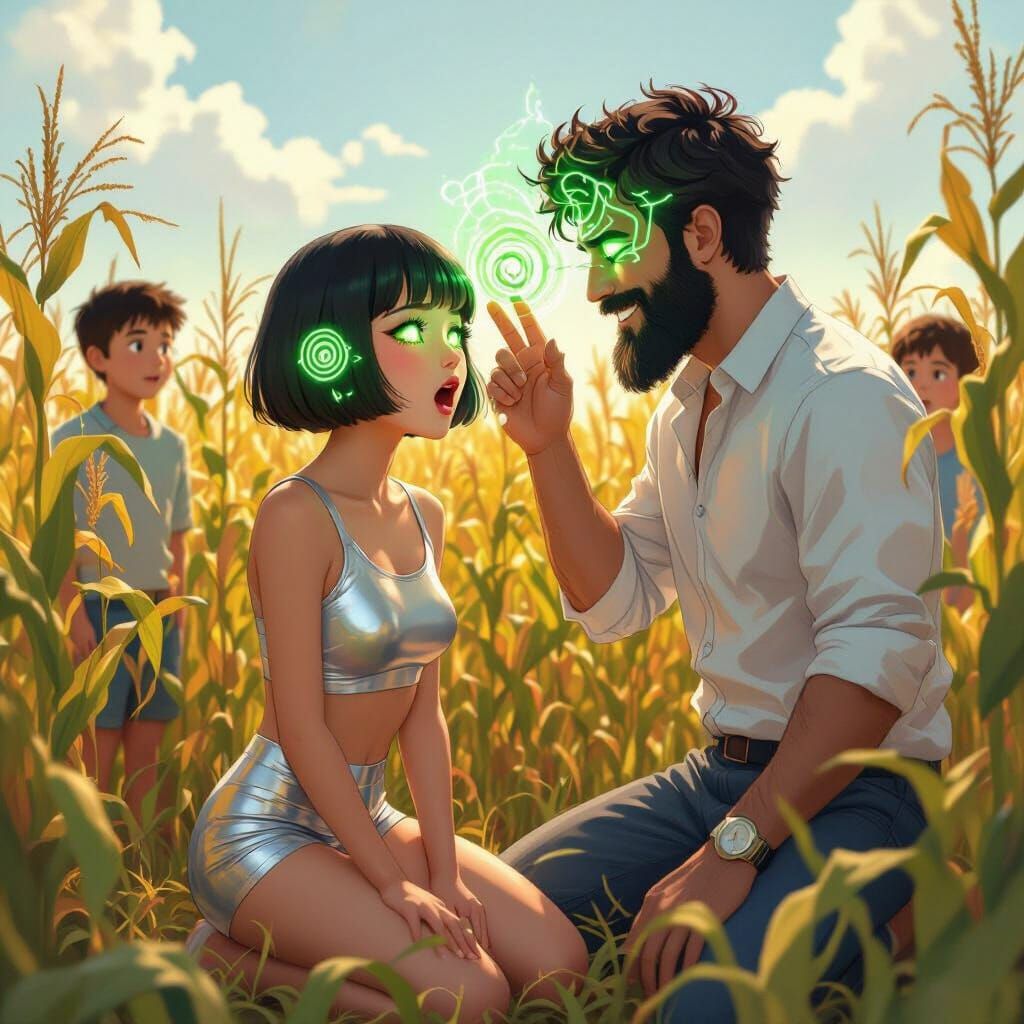 This image depicts an Asian girl kneeling in a cornfield, seemingly hypnotized by a man. The background features astonished boys. The scene is rendered in a whimsical, dreamlike style with vibrant patterns and ethereal lighting.