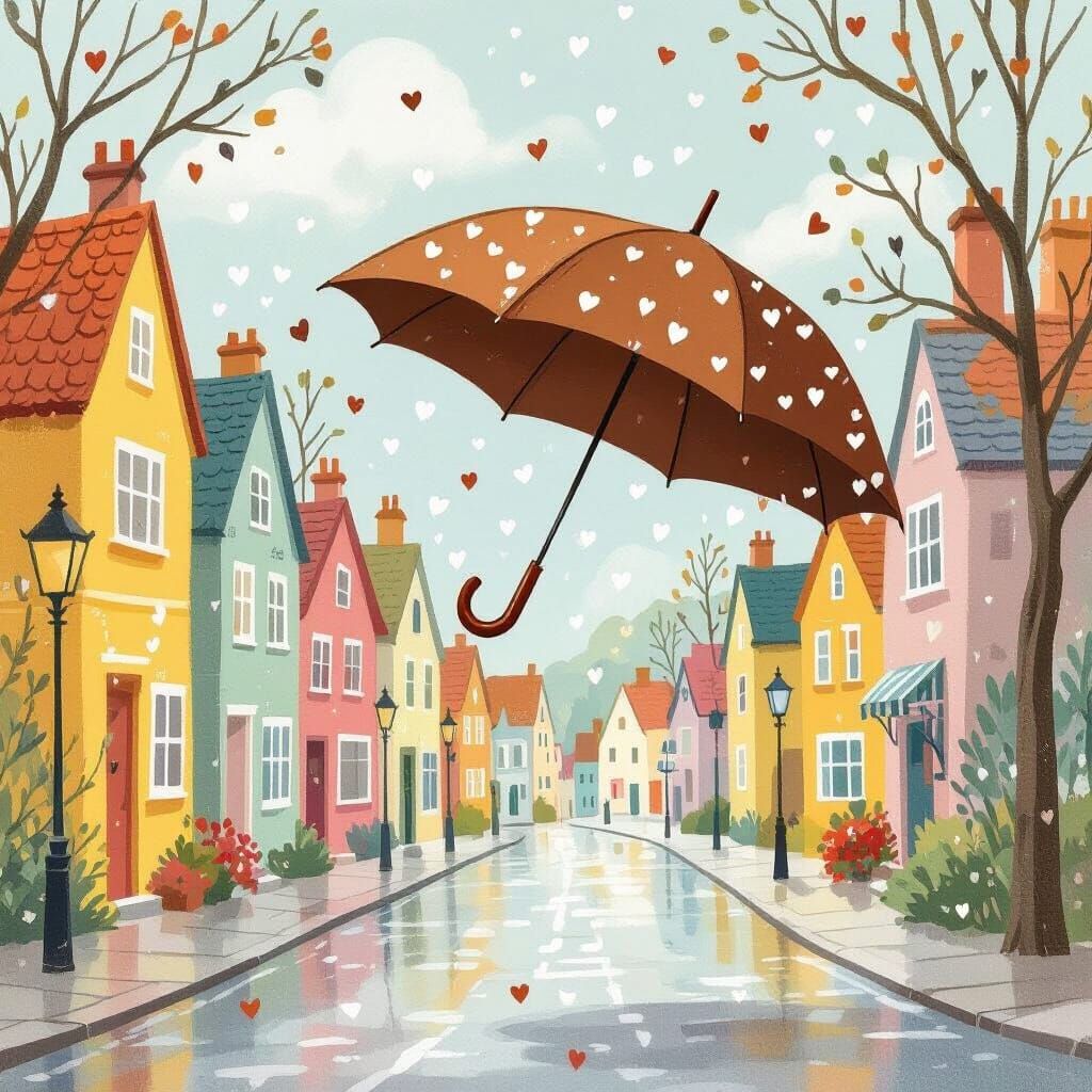 A whimsical illustration of a brown umbrella with white hearts being carried by the wind through a vibrant town. Rendered in a charming storybook style with saturated colours and soft lighting.