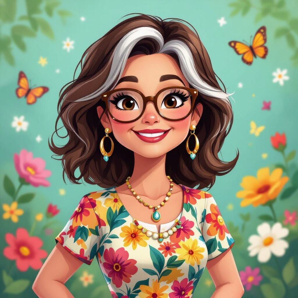 This image shows a cheerful cartoon avatar of a middle-aged woman with brown hair and glasses, adorned with jewelry and a vibrant dress. The style evokes Disney and Studio Ghibli animation.