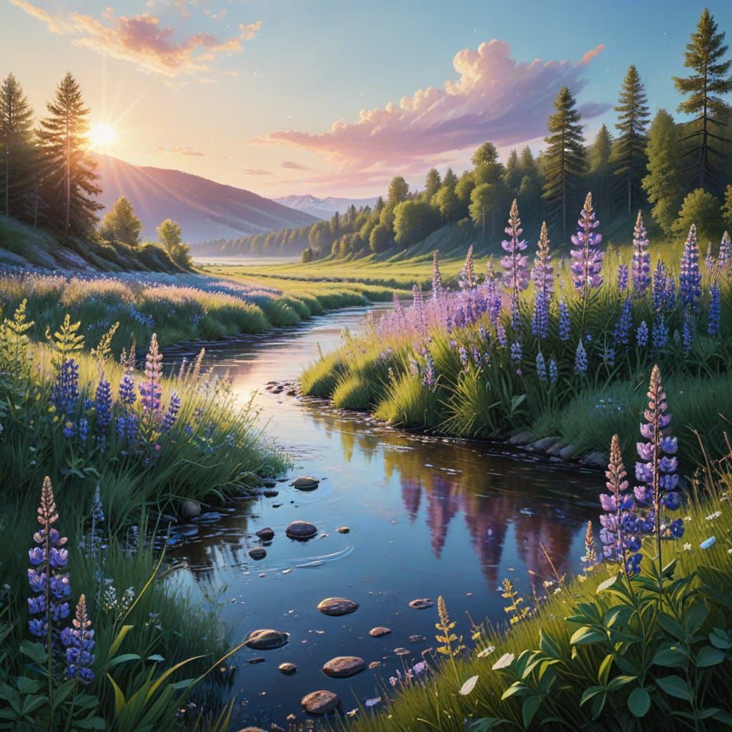 A striking picture of a river flowing through a lush meadow filled with lupines under a clear sky. Soft pastel tones and a gentle glow create a serene, vibrant summer landscape in a hyperrealistic style.