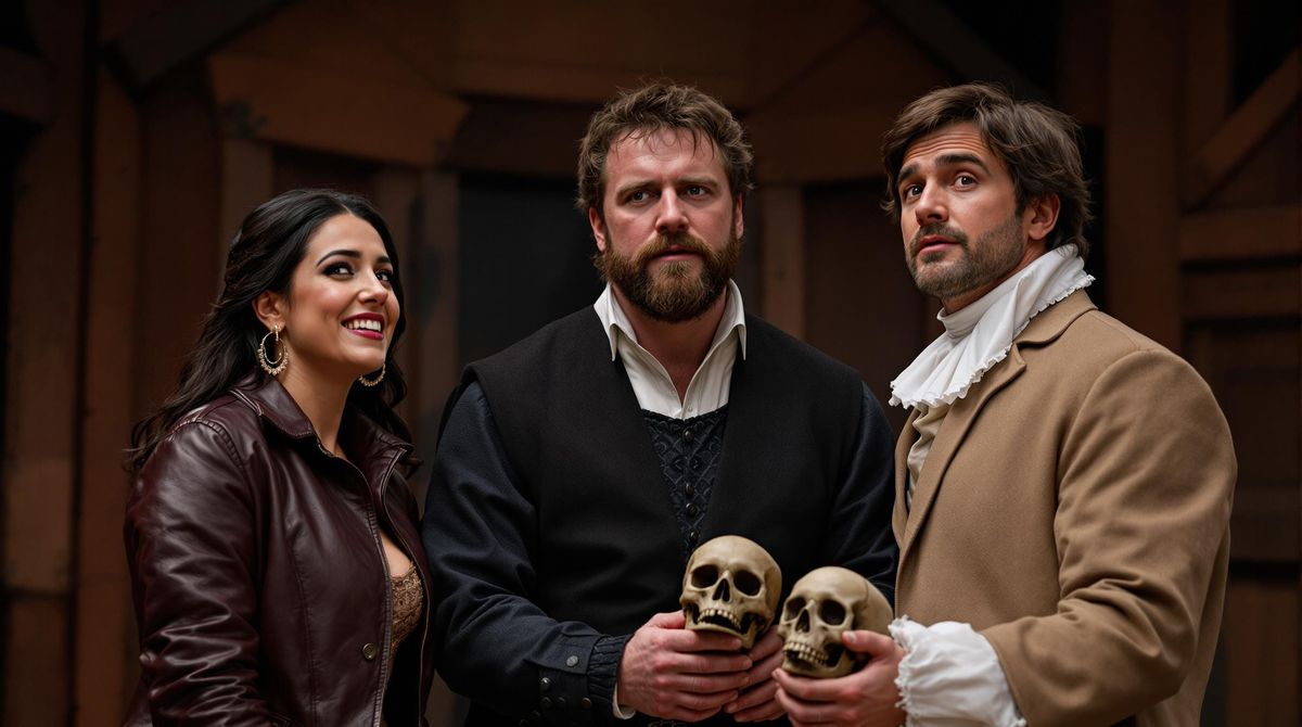 This image shows three figures in a historical drama setting. The scene, rendered in warm browns and ochres, depicts a woman in a leather jacket and two men in Renaissance and 19th-century attire.