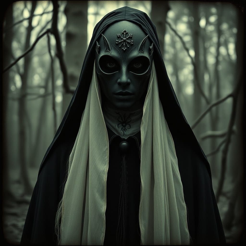 This image is a haunting portrait of a mysterious priestess, set amidst the eerie atmosphere of an enchanted forest, with inspiration drawn from the works of William Mortensen and the Pictorialist movement.