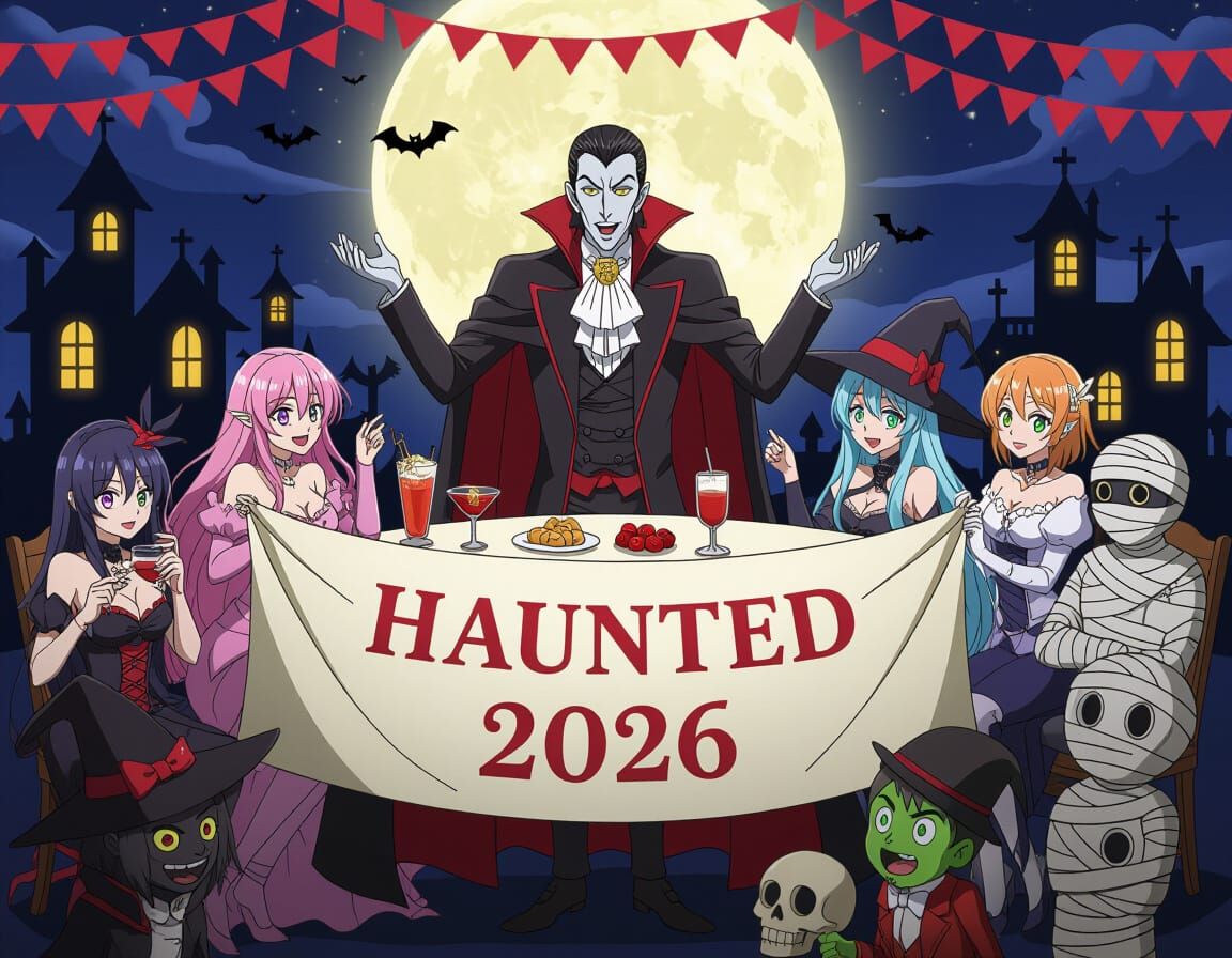 This image shows Dracula hosting a New Year's Eve party with various monsters like werewolves and zombies, featuring a 'Haunted 2026' banner, in a Japanese anime art style.