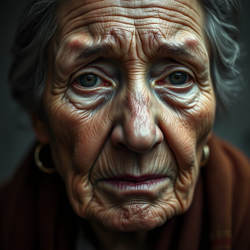 A close-up portrait of a woman, her face etched with the weight of modern life, illuminated by soft light that casts a subtle glow on her weathered skin, capturing the emotional depth and desperation of a generation.