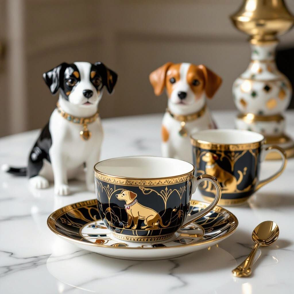 This image showcases luxury Art Deco pet tableware with dogs and cats. The accessories feature metallic gold, black, and jewel tones, creating a Jazz Age aesthetic. The high-end photography uses bokeh and natural lighting.