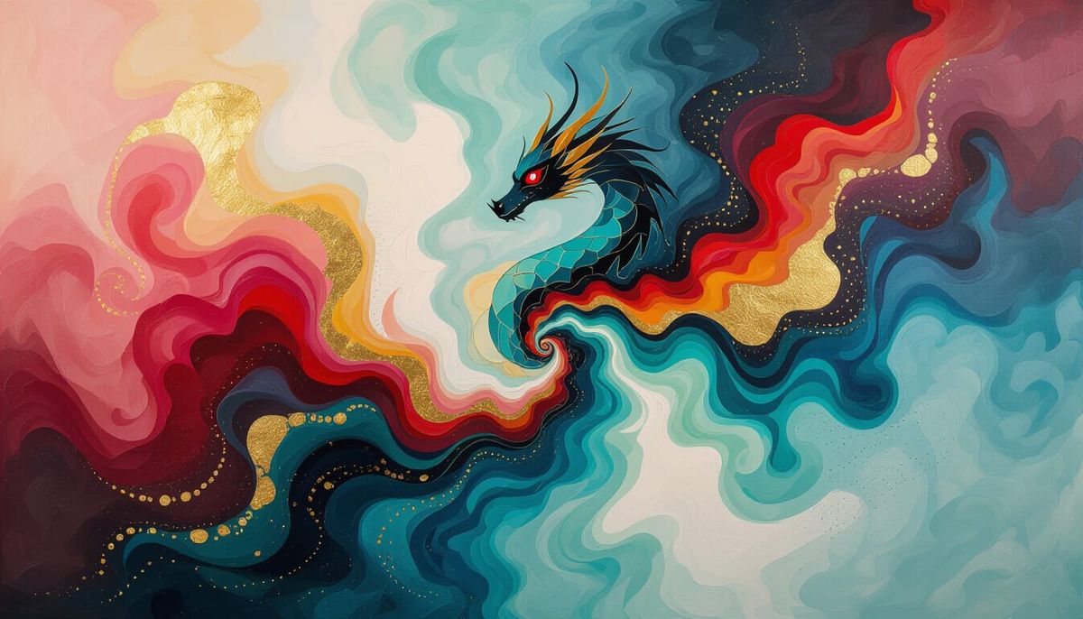 A surreal image of a dragon formed from swirling, colorful smoke. The artwork is rendered in an impressionistic watercolor style, reminiscent of Monet, with textured metallic accents.
