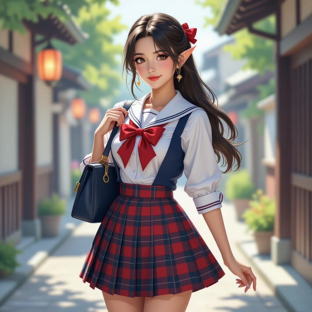 A photorealistic image of an elegant elf woman in a Japanese schoolgirl uniform, detailed with plaid skirt and blouse, showcasing poise.